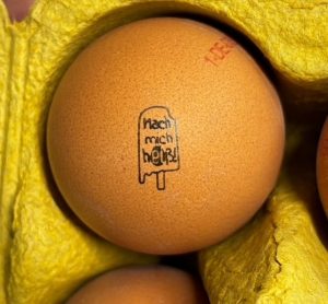Wir haben im Dezember einen professionellen Eier-Stempel gekauft und werden euch nun immer mal wieder mit kleinen Botschaften auf den Eiern überraschen! ;o)