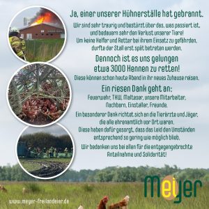 Als der Brand dann weitestgehend gelöscht war und die Feuerwehr die hinteren großen Türen öffnete, kamen uns überraschend etwa 3.000 Tiere entgegen – davon viele absolut unversehrt. Daraufhin war uns klar, dass wir umgehend tierärztliche Unterstützung benötigen würden. Das Veterinäramt konnte auf Grund eines Falls von Geflügelpest im Landkreis nicht kommen. So organsierten wir 6 Tierärzte und 3 Jäger privat – das THW, unsere Angestellten und wir gingen in den Stall, um jedes Huhn herauszuholen, das noch lebte. Es waren schreckliche Bilder – und wir taten, was getan werden musste.  Ein Tierarzt entschied, ob das Tier besser erlöst werden sollte, oder ob es in den provisorisch errichteten Stall gebracht werden kann. Zeitgleich bauten Nachbarn und Freunde diesen Stall auf einem vorderen Teil unseres Betriebs, während zwei Nachbarn mit Treckern und Anhängern die Tiere nach vorne transportierten. Unsere Kinder versorgten die Hennen mit Futter und Wasser.